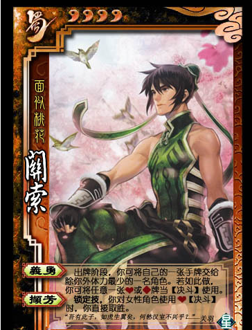 关索是一位嘲讽度极高的武将,说到关索一定要说的就是他那强大的滚雪球能力,只要场上有人死亡他就可以获得一个技能还可以摸三张牌。这个技能的后期强大也就注定了关索前期的弱,想要玩关索要做的第一件事就是活下去,只有隐忍下去进入自己的节奏才能获得胜利。