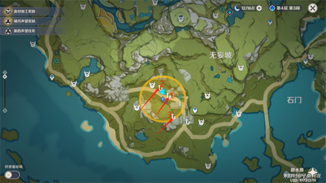 3-1:第三处在黄圈边缘那个小山丘后面,旁边还有两个丘丘人守着。