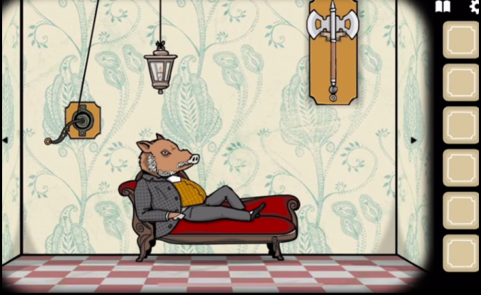 进入野猪先生房间后,首先需要拆下沙发上方悬挂的吊灯作为关键道具。随后在窗户附近找到一朵罂粟花,点击花瓣可获得类似鸦片的物品,同时注意查看墙上的印章图案。房间内右侧的密码...