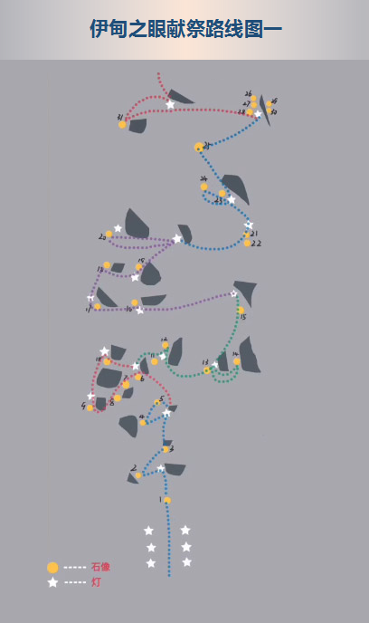 一路上尽可能多的献祭(点先祖)依靠石灯补充能量,躲避飞石,准时机走到先祖身边即可。这部分主要分为两个阶段,下面为大家分享路线图: