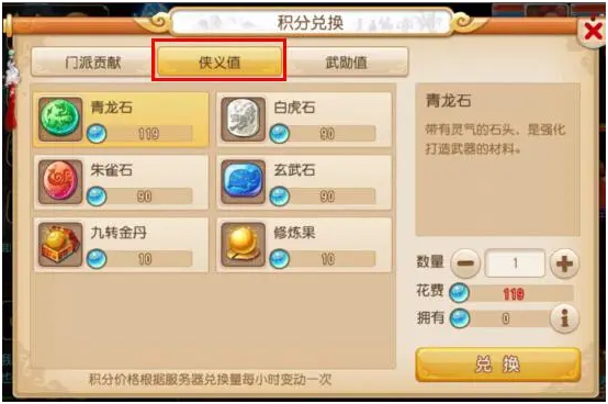 2.侠义值尽量每天拿满,白虎石朱雀石价格在110以下时可以兑换,玄武石青龙石不建议用侠义值换;